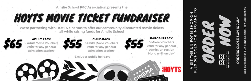 Hey friends of Ainslie School! We're offering great deals on HOYTS movie tix: 5 Adult Movie Vouchers valid for any general admission session $65 save up to $9 a ticket5 Child Movie Vouchers valid for any general admission session $55 save up to $7 a ticket5 Movie Vouchers valid for general admission session Monday-Thursday only … Continue reading HOYTS movie ticket fundraiser