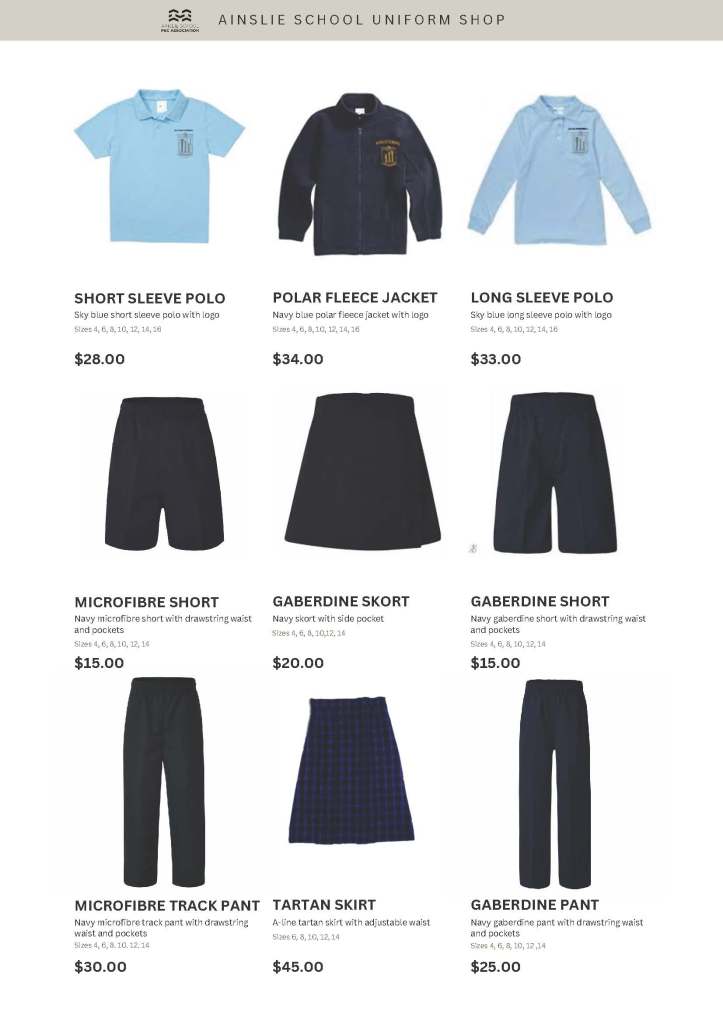 The Uniform Shop is open every Wednesday from 8:45 to 9:15 during the school term. We also open before the beginning of each school year. If you’re new to the Ainslie community and want more information on opening times, please email us at ainslie.uniforms@gmail.com.