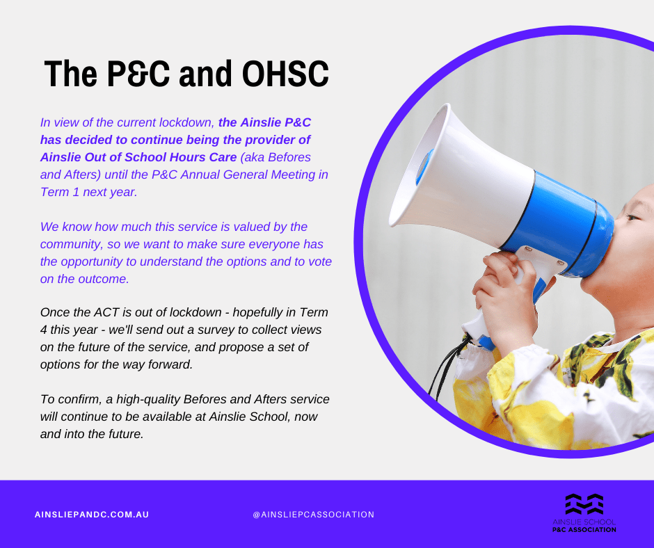 Ainslie School P&C Committee is calling on all parents and carers to nominate as committee members at the upcoming Annual General Meeting (AGM) scheduled for the end of term 1. To continue operating key services for our families – Oishii Canteen, the Uniform Shop and Ainslie Out of School Hours Care (OSHC) – we need … Continue reading The Ainslie School Parents and Citizens (P&C) Association needs you